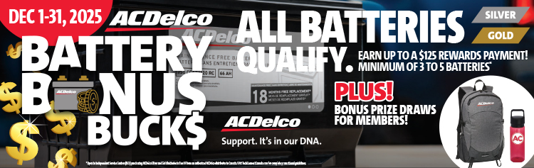 *Open to Independent Service Centres (ISCs) purchasing ACDelco Silver and Gold batteries in line 07 from an authorized ACDelco distributor in Canada. Promotion runs from December 1, 2025 to December 31, 2025. Void outside Canada and where prohibited. Minimum purchase requirement of 3 batteries. Once the assigned minimum is met, ISCs will earn $5 in applicable Bonus Rewards for each battery purchased, up to a maximum of $125 per qualifying accounts. Qualifying program members will also earn one (1) draw ballot for every battery purchased for the exclusive Program Member Bonus Draws. All net purchases will be reported directly by the repair facilities’ ACDelco qualifying supplier. Only qualifying Canadian Full Line ACDelco Distributors qualify to report purchases to ACDelco. Qualifying ACDelco batteries purchased from multiple reporting Distributors will be combined for the bonus calculation. Active ACDelco PSC, ACE, PSC RSSP and RSSP Basic members are entered automatically and do not need to register. ACDelco is not required to contact accounts that did not qualify. Odds of winning the Bonus Draws depend on total number of eligible entries received per Contest Entry Period. The Bonus rewards earned for qualifying ACDelco PSC, ACE and PSC RSSP members will be paid to their reloadable Visa Reward card to the cardholder on file or through an ACDelco Distributor rebate. The promotion is open only to Independent Vehicle Repair Facilities with active businesses in all Provinces and Territories in Canada. GM Dealers, Original Equipment New Vehicle Dealers and any of their subsidiaries, ACDelco Distributors or jobbers do not qualify. The images shown are for illustration purposes only and may not be an exact representation of the product. Prizes must be accepted as awarded and are not transferable, assignable or convertible to cash. ACDelco reserves the right to modify or cancel this promotion at any time for any reason. >>Click here for the promotion rules.