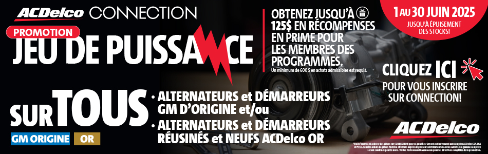 *Promotion ouverte aux comptes CSP, ESA, CSP PSSD et PSSD ACDelco qui sont entièrement approuvés en tant que membres actifs du programme ACDelco d'ici le 30 juin 2025 et qui s'inscrivent via l'application CONNECTION. Les comptes admissibles qui achètent un minimum de 600 $ en démarreurs et alternateurs GM d’Origine et(ou) démarreurs et alternateurs réusinés et neufs ACDelco Or peuvent gagner 25 $ récompenses en PRIME pour les membres des programmes. Maximum de 125 $ en récompenses en prime pour les membres des programmes par compte admissible. Il s'agit d'une combinaison de 25 $ de qualifications, pour chaque 600 $ d'achats de pièces. Les comptes enregistrés achetant auprès de plusieurs distributeurs via CONNECTION verront leurs achats admissibles combinés pour le rapprochement du boni. L'attribution maximale par ACDelco pour la promotion est 15 000 $ et les récompenses seront remises aux premiers comptes qui se seront qualifiés, jusqu’au montant maximal alloué. Une fois que le paiement total de 15 000 $ en récompenses du programme aura été attribué, la promotion se terminera, qu'elle soit avant la fin du mois de juin. Nous ne sommes pas responsables des problèmes de serveur, d'ordinateur ou autres qui pourraient retarder l'inscription à la promotion. Seuls les numéros de pièces ACDelco des gammes 31 et 33 sont admissibles. Les récompenses en prime de la promotion seront appliquées en tant que boni et appliquées après le rapprochement des achats de juin 2025 en aout 2025. Les récompenses en prime seront versées aux membres admissibles en fonction de leur mode de paiement des récompenses au 30 juin 2025. Les comptes PSSD de base ACDelco admissibles auront des récompenses remplacées par des cartes-cadeaux Ultimate Dining. Les concessionnaires GM, les distributeurs ACDelco ou les grossistes ne sont pas admissibles. Les achats ACDelco doivent être effectués par le centre de service indépendant auprès d'un distributeur ACDelco de gamme complète autorisé, qui s'abonne à l'application CONNECTION. ACDelco se réserve le droit de modifier ou d'annuler cette promotion à tout moment pour quelque raison que ce soit.