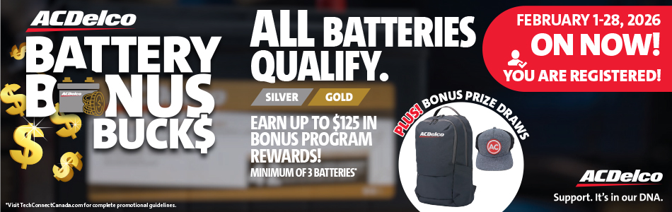 *Open to Independent Service Centres (ISCs) purchasing ACDelco Silver and Gold batteries in line 07 from an authorized ACDelco distributor in Canada. Promotion runs from February 1, 2026 to February 28, 2026. Void outside Canada and where prohibited. Minimum purchase requirement of 3 batteries. Once the assigned minimum is met, ISCs will earn $5 in applicable Bonus Rewards for each battery purchased, up to a maximum of $125 per qualifying accounts. Qualifying program members will also earn one (1) draw ballot for every battery purchased for the exclusive Program Member Bonus Draws. All net purchases will be reported directly by the repair facilities’ ACDelco qualifying supplier. Only qualifying Canadian Full Line ACDelco Distributors qualify to report purchases to ACDelco. Qualifying ACDelco batteries purchased from multiple reporting Distributors will be combined for the bonus calculation. Active ACDelco PSC, ACE, PSC RSSP and RSSP Basic members are entered automatically and do not need to register. ACDelco is not required to contact accounts that did not qualify. Odds of winning the Bonus Draws depend on total number of eligible entries received per Contest Entry Period. The Bonus rewards earned for qualifying ACDelco PSC, ACE and PSC RSSP members will be paid to their reloadable Visa Reward card to the cardholder on file or through an ACDelco Distributor rebate. The promotion is open only to Independent Vehicle Repair Facilities with active businesses in all Provinces and Territories in Canada. GM Dealers, Original Equipment New Vehicle Dealers and any of their subsidiaries, ACDelco Distributors or jobbers do not qualify. The images shown are for illustration purposes only and may not be an exact representation of the product. Prizes must be accepted as awarded and are not transferable, assignable or convertible to cash. ACDelco reserves the right to modify or cancel this promotion at any time for any reason. >>Click here for the full promotion guidelines.