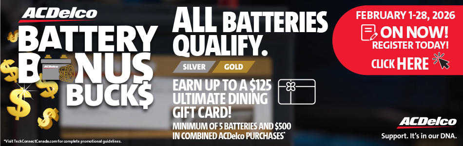 *Open to Independent Service Centres (ISCs) purchasing ACDelco Silver and Gold batteries in line 07 from an authorized ACDelco distributor in Canada. Promotion runs from February 1-28, 2026. Void outside Canada and where prohibited. Minimum net purchase requirement of 5 ACDelco batteries with a $500 in combined ACDelco purchases. Once the assigned minimums are met, ISCs will earn $5 in applicable gift card earnings for each battery purchased, up to a maximum of $125 per qualifying account. One registration per repair facility. Duplicates will not be accepted. Only qualifying Canadian Full Line ACDelco Distributors qualify to report purchases to ACDelco. All net purchases will be reported directly by the repair facilities’ ACDelco qualifying supplier. Qualifying ACDelco batteries purchased from multiple reporting Distributors will be combined for the bonus calculation. Qualifying non-program member ISCs must register for the promotion by February 23, 2026 at 12:00am EST to qualify. We are not responsible for any server, computer, or other issues delaying your registration for the promotion. ACDelco is not required to contact accounts that did not qualify. The Bonus Rewards earned for qualifying non-program member ISCs will be paid on an Ultimate Dining gift card. The promotion is open only to Independent Vehicle Repair Facilities with active businesses in all Provinces and Territories in Canada. GM Dealers, Original Equipment New Vehicle Dealers and any of their subsidiaries, ACDelco Distributors or jobbers do not qualify. Prizes must be accepted as awarded and are not transferable, assignable or convertible to cash. ACDelco reserves the right to modify or cancel this promotion at any time for any reason. >>Click here for the promotion rules.