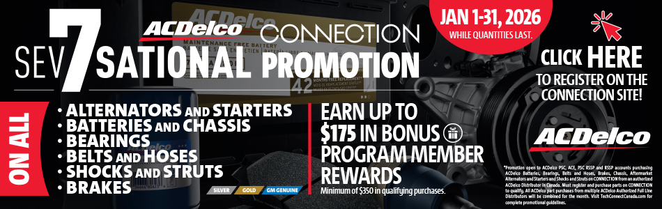 *Promotion open to ACDelco PSC, ACE, PSC RSSP and RSSP accounts purchasing ACDelco Batteries, Bearings, Belts and Hoses, Brakes, Chassis, Aftermarket Alternators and Starters and Shocks and Struts within ACDelco lines 7, 2, 35, 17, 14, 44, 45, 46, 33, 5 and 9 within the CONNECTION application from an authorized ACDelco Distributor in Canada. Must register and purchase parts through CONNECTION to qualify. Promotion runs from January 1, 2026 to January 31, 2026 or until the maximum allotment of rewards is reached. The maximum allotment of rewards overall for the promotion by ACDelco will be a total distribution of $35,000 in Program rewards, allotted on a first-qualified basis. Once the total payout of $35,000 in Program Rewards is allotted, the promotion will end, regardless of if it is before the end of January. An individual registration by the qualifying active member is required within CONNECTION along with a minimum purchase of $350 in qualifying parts to qualify. Once the minimum purchase requirement is met, qualifying accounts will earn $25 for every $350 in qualifying parts purchases. A maximum of a $175.00 BONUS per qualifying account will be paid out. Registered accounts that are buying from more than one distributor through CONNECTION will have their qualifying purchases combined for the Bonus reconciliation. Must be an active ACDelco PSC, ACE, PSC RSSP or RSSP member by January 31, 2026 and must register through the CONNECTION application to qualify. All net purchases will be reported directly by the repair facilities’ ACDelco qualifying supplier via the CONNECTION application. Only qualifying Canadian Full Line ACDelco Distributors qualify to report purchases to ACDelco. We are not responsible for any server, computer, or other issues delaying the registration for the promotion. ACDelco is not required to contact accounts that did not qualify. The Bonus rewards earned for qualifying ACDelco PSC, ACE and PSC RSSP members will be paid as per the account’s standard payment method, either to their reloadable Visa Reward card to the cardholder on file or through an ACDelco Distributor rebate. GM Dealers, Original Equipment New Vehicle Dealers and any of their subsidiaries, ACDelco Distributors or jobbers do not qualify. Bonus Rewards must be accepted as awarded and are not transferable, assignable or convertible to cash. ACDelco purchases must be made from an authorized ACDelco Full Line Distributor who subscribes to the CONNECTION application. ACDelco reserves the right to modify or cancel this promotion at any time for any reason. Log into TechConnect Canada for the full promotion guidelines.