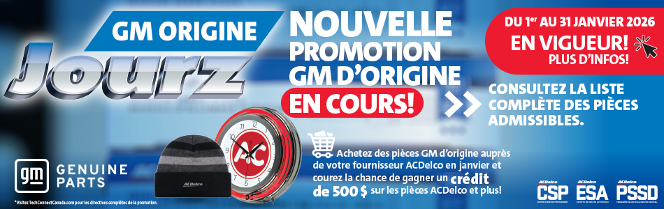 *La promotion Jourz GM d'origine de janvier 2026 est ouverte aux centres de service indépendants (CSI) achetant des pièces GM d'origine dans les gammes de produits 01, 02, 04, 05, 08, 13, 15, 16, 17, 18, 19, 20, 21, 23, 25, 27, 30, 31, 35, 36, 37, 43, 48, 50, 51, 55 et 56 d'un distributeur ACDelco autorisé au Canada. Les pièces admissibles comprises dans les gammes de produits de la promotion et dans les sous-gammes incluent toutes les pièce GM d’origine suivantes : alternateurs et démarreurs, amortisseurs et jambes de force, ampoules, charnières et axes de porte, climatisation, composants de la boîte de vitesses, composants du moteur, courroies et durites, dispositifs antipollution, injection de carburant et modules de commande, échappement, cadres et réservoirs de carburant, éclairage, électronique, ensembles de moyeux de roue et joints d’étanchéité d'huile, fils et câbles, filtres à air d'habitacle, filtres de transmission, moteurs et régulateurs de vitres, pièces d’allumage, pièces de carrosserie intérieures ,pièces de direction et entraînement, pièces de frein, pompes à carburant, pompes à eau, radiateurs, roues (jantes en acier),thermostats et bouchons, usage léger, bras/moteur/pompe/pièces et moteurs/transmission - produits d'essuie-glace. Seules les pièces GM d’origine ÉO comprises dans les gammes de produits spécifiées et dans les sous-gammes admissibles sont admissibles aux bulletins. Les pièces ACDelco Or et Argent des gammes de produits en promotion ne sont pas admissibles. Seules les gammes, sous-gammes et UGS GM d'origine actuellement offertes aux distributeurs ACDelco sont admissibles à la promotion. Les gammes réservées aux concessionnaires GM ne sont pas admissibles. La promotion est en vigueur du 1er au 31 janvier 2026. Les pièces admissibles comprises dans les gammes de produits de la promotion et dans les sous-gammes incluent toutes les pièce GM d’origine suivantes : alternateurs et démarreurs, amortisseurs et jambes de force, ampoules, charnières et axes de porte, climatisation, composants de la boîte de vitesses, composants du moteur, courroies et durites, dispositifs antipollution, injection de carburant et modules de commande, échappement, cadres et réservoirs de carburant, éclairage, électronique, ensembles de moyeux de roue et joints d’étanchéité d'huile, fils et câbles, filtres à air d'habitacle, filtres de transmission, moteurs et régulateurs de vitres, pièces d’allumage, pièces de carrosserie intérieures ,pièces de direction et entraînement, pièces de frein, pompes à carburant (gamme 43),pompes à eau, radiateurs, roues (jantes en acier),thermostats et bouchons, usage léger, bras/moteur/pompe/pièces et moteurs/transmission - produits d'essuie-glace. Seules les pièces GM d’origine ÉO comprises dans les gammes de produits spécifiées et dans les sous-gammes admissibles sont admissibles aux bulletins. Les pièces ACDelco Or et Argent des gammes de produits en promotion ne sont pas admissibles. Seules les gammes, sous-gammes et UGS GM d'origine actuellement offertes aux distributeurs ACDelco sont admissibles à la promotion. Les gammes réservées aux concessionnaires GM ne sont pas admissibles. Non valable à l'extérieur du Canada et là où la loi l'interdit. Achat net minimum requis de 300 $ en pièces GM d'origine admissibles combinées des gammes de produits en promotion. Une fois que le minimum d'achat net de la promotion de 300 $ sera atteint, les CSI admissibles recevront trois (3) bulletins de participation pour les achats de 300 $ et un (1) bulletin de participation supplémentaire pour chaque tranche de 100 $ supplémentaire d'achats admissibles. Les bulletins de participation des comptes admissibles seront placés dans nos soixante-cinq (65) tirages pour l'un des prix, en commençant par les trois (3) grands prix promotionnels, suivis des deuxièmes et troisièmes prix. Au total, soixante-cinq (65) prix promotionnels seront attribués dans le cadre de la promotion. Il y aura cinq (5) grands prix consistant en un crédit de 500 $ CA sur les pièces ACDelco, à utiliser pour les achats de pièces ACDelco ou GM d'origine chez un distributeur canadien de la gamme complète de pièces ACDelco autorisé. Consultez le règlement officiel de la promotion pour connaître les modalités du crédit sur les pièces. Les CSI admissibles qui n'ont pas gagné le grand prix seront inscrits à un deuxième tirage pour courir la chance de gagner l'une des dix (10) horloges rétro ACDelco (d'une valeur de 150 $ CA) et un troisième tirage pour courir la chance de gagner l'une des cinquante (50) tuques ACDelco (d'une valeur de 25 $ CA). Les tirages sont des tirages au sort à l'échelle nationale et comprennent tous les bulletins de participation obtenus par les comptes admissibles partout au pays. Limite d'une (1) récompense par compte de membre ACDelco admissible. Les tirages auront lieu de trois (3) à quatre (4) semaines après le rapprochement des promotions en février 2026. L'Info-Ligne ACDelco communiquera avec les comptes admissibles peu de temps après la fin des tirages. Les gagnants devront remplir et signer un formulaire de décharge et répondre à une question réglementaire d'arithmétique dans les cinq jours ouvrables pour gagner officiellement le prix. Les horloges rétro et les tuques seront postées au propriétaire de l'entreprise et à l'adresse postale au dossier de huit (8) à dix (10) semaines après le tirage et la soumission de tous les documents. Les chances de gagner dépendent du nombre total de bulletins de participation admissibles reçus pendant la période de participation au concours. Aucun achat requis – Une autre méthode de participation est possible pour les tirages de la promotion si un achat promotionnel n'est pas possible (voir le règlement officiel des promotions pour les détails de la participation). Seuls les distributeurs canadiens de la gamm