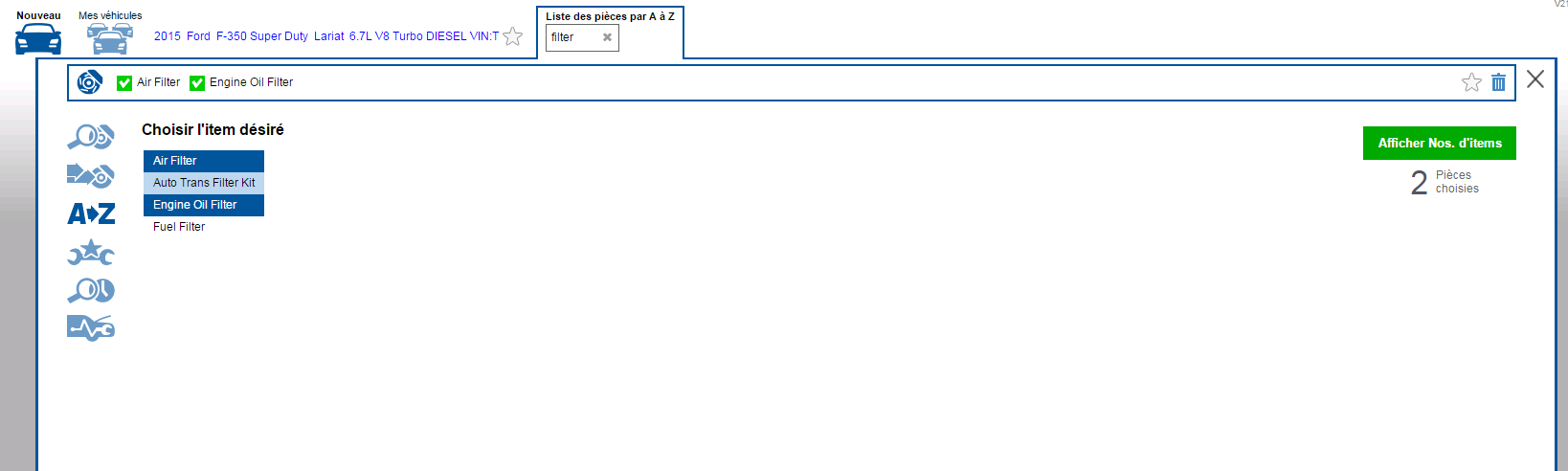 Vous en avez assez de feuilleter un catalogue en vous demandant « où diable ont-ils classé cette pièce »? La « Liste de pièces A à Z » vous fournit une liste de tous les types de pièces disponibles pour le véhicule choisi. Toutes les pièces énumérées conviennent à ce véhicule – fini les pertes de temps à chercher des pièces que vous ne pouvez pas acheter! Les Types de pièces s’affichent par ordre alphabétique pour éliminer le besoin de connaître leur catégorie.