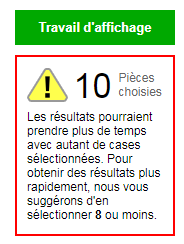 Le compteur « Pièces choisies » signalera lorsque le nombre de Types de pièce choisis atteint un niveau qui pourrait avoir un impact sur le rythme d’affichage des résultats. Vous aurez la possibilité de continuer; cependant, l’affichage des résultats pourrait prendre plus de temps.