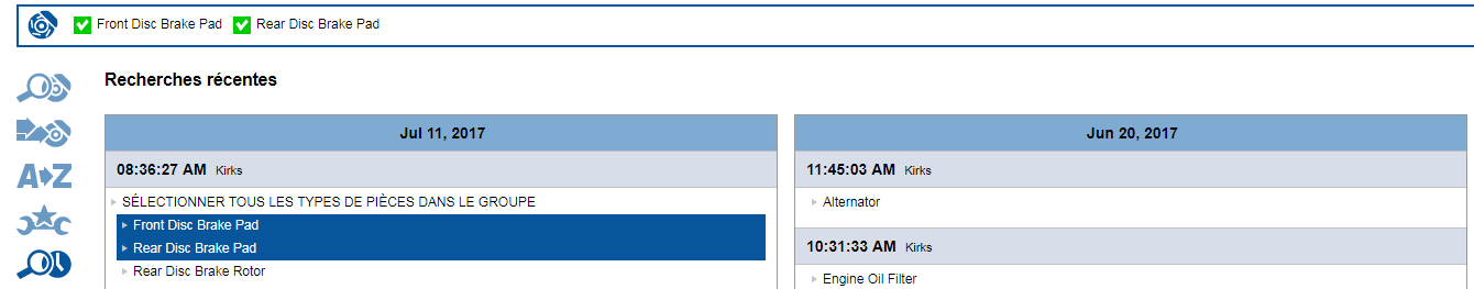Les Recherches récentes s’afficheront lorsque le véhicule choisi a été récupéré des « Véhicules précédents » ou « Véhicules favoris » et indiqueront les recherches que vous avez effectuées pour le véhicule choisi.