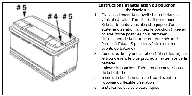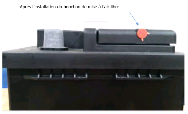 Lorsqu'un véhicule dispose d'un seul tuyau d'évent, il faut boucher l'ouverture de l'évent qui se trouve à l'opposé du couvercle de la batterie à l'aide du bouchon de mise à l'air libre compris.