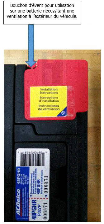 Sur les batteries qui doivent être ventilées se trouve un couvercle de bornes rouges (illustré ci-dessous). Celui-ci comporte un bouchon de mise à l'air libre amovible qui doit être inséré dans l'évent se trouvant à l'opposé du tuyau d'évent qui débouche à l'extérieur du véhicule. Voici des instructions indiquant comment installer adéquatement les bouchons.