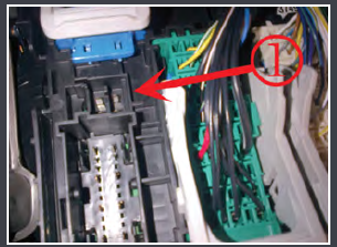 Step 2: Connect the harness to the MIDBEC (X61A), which is located under the instrument panel to the left of the steering column. The harness connection point (1) is shown in the illustration below.