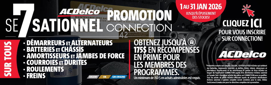 *Promotion ouverte aux comptes CSP, ESA, CSP PSSD et PSSD ACDelco qui achètent des batteries, roulements, courroies et durites, freins, châssis, démarreurs et alternateurs d’après-vente et les amortisseurs et jambes de force ACDelco des gammes ACDelco 7, 2, 35, 17, 14, 44, 45, 46, 33, 5 et 9 au moyen de l’application CONNECTION auprès d'un distributeur ACDelco autorisé au Canada. Les membres doivent s’inscrire et acheter les pièces par l’entremise de CONNECTION pour se qualifier. La promotion se déroule du 1er janvier 2026 au 31 janvier 2026, ou jusqu’à ce que ou jusqu'à ce que l’attribution maximale des récompenses soit atteint. L'attribution maximale par ACDelco pour la promotion est 35 000 $ et les récompenses seront remises aux premiers comptes qui se seront qualifiés, jusqu’au montant maximal alloué. Une fois que le paiement total de 35 000 $ en récompenses du programme aura été attribué, la promotion se terminera, qu'elle soit avant la fin du mois de janvier. Une inscription individuelle par le membre actif admissible est requise dans CONNECTION avec un achat minimal de 350 $ en pièces admissibles pour se qualifier. Une fois que l’exigence minimale d’achat est atteinte, les comptes admissibles obtiendront 25 $ par tranche de 350 $ en achats admissibles. Maximum d’un BONI de 175 $ par compte admissible sera versé. Les comptes enregistrés achetant auprès de plusieurs distributeurs sur CONNECTION verront leurs achats admissibles combinés pour le rapprochement du boni. Le membre doit être un compte CSP, ESA, CSP PSSD ou PSSD actif en date du 31 janvier 2026 et doit s’inscrire par l’entremise de l’application CONNECTION pour se qualifier. Tous les achats nets seront signalés directement par le fournisseur ACDelco admissible des installations de réparation sur l’application CONNECTION. Seuls les distributeurs canadiens de la gamme complète de produits ACDelco peuvent déclarer les achats à ACDelco. Nous ne sommes pas responsables des problèmes de serveur, d'ordinateur ou autres qui pourraient retarder votre inscription à la promotion. ACDelco n'est pas tenue de communiquer avec les détenteurs de compte qui ne seront pas admissibles. Les récompenses bonis gagnées par les membres CSP, ESA et CSP PSSD ACDelco admissibles seront payées selon le mode de paiement standard du compte, soit sur leur carte Visa des récompenses rechargeable, au nom du titulaire de la carte, ou par l’entremise d’une remise du distributeur ACDelco. Les comptes PSSD de base ACDelco recevront leurs récompenses gagnées sous forme d’une carte-cadeau Ultimate Dining. Les concessionnaires GM, les concessionnaires de véhicules neufs d'origine et leurs filiales, les distributeurs ou les grossistes ACDelco ne sont pas admissibles. Les récompenses doivent être acceptés tel qu'ils sont attribués et ne peuvent être transférés ni convertis en argent comptant. Les achats ACDelco doivent être effectués par le centre de service indépendant auprès d'un distributeur ACDelco de gamme complète autorisé, qui s'abonne à l'application CONNECTION. ACDelco se réserve le droit de modifier ou d'annuler cette promotion en tout temps et pour quelque raison que ce soit. Connectez-vous à TechConnect Canada pour connaître les directives complètes de la promotion.