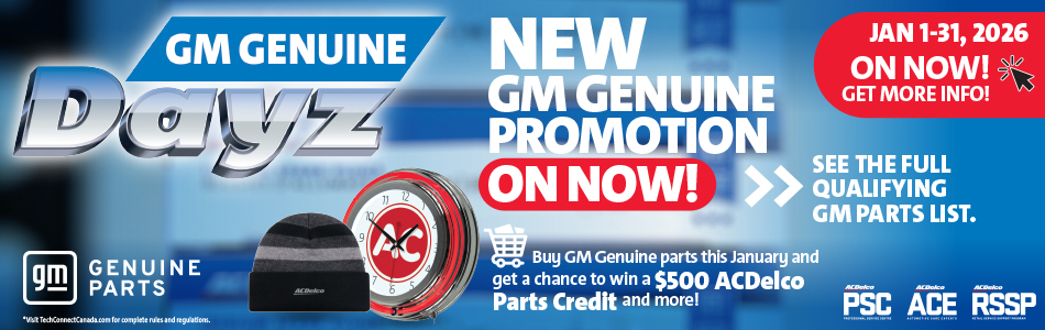*The 2026 January GM Genuine Dayz is open to Independent Service Centres (ISCs) purchasing specific qualifying GM Genuine parts in product lines 01, 02, 04, 05, 08, 13, 15, 16, 17, 18, 19, 20, 21, 23, 25, 27, 30, 31, 35, 36, 37, 43, 48, 50, 51, 55 and 56 from an authorized ACDelco distributor in Canada. Promotion runs from January 1-31, 2026.  Qualifying parts found within the promotion product lines and in the sub lines include all GM Genuine Air Conditioning, Brake Parts, Cabin Air Filters, Drive Belts, Hub Bearing Assemblies, Electronics, Emission Control, Exhaust, Frames & Gas Tanks, Fuel Pumps, Exterior Body/Chassis, Ignition Parts, Interior Body Parts, Light Duty Wipers, Motors & Window Regulators, Oil Seals, Radiators, Sheet Metal, Shocks, Steering & Drive Systems, Starter & Alternators, Thermostats/Caps, Transmissions Filters, Transmission Parts, Water Pumps, Wiper Arm/Pump/Part and Wiper Motors Wire & Cable. Only qualifying GM Genuine OE Parts in the specified product lines and within those sub lines qualify for ballots. ACDelco Gold and Silver parts found within the promotion product lines do not qualify.  Only GM Genuine O.E. lines, sublines and SKUs currently available to ACDelco Distributors qualify for the promotion. GM Dealer only lines do not qualify. Void outside Canada and where prohibited. Minimum net purchase requirement of $300 in combined qualifying GM Genuine parts from the promotion product lines. Once the $300 net promotion purchase minimum is met, qualifying ISCs will earn five (5) draw ballots for the $300 in purchases, and one (1) additional ballot for every additional $100 in qualifying purchases. The ballots of qualifying accounts will be placed in our sixty-five (65) draws for a chance to win one of the prizes, starting with the three (3) Grand Prize promotional prizes, followed by the secondary and third prizes. A total of sixty-five (65) promotional prizes will be awarded for the promotion. There will be five (5) Grand Prizes of a $500 CAD ACDelco Parts Credit, to be used for ACDelco and/or GM Genuine parts purchases at an Authorized ACDelco Full Line Canadian Distributorship. Refer to the official promotion rules for terms and conditions of the parts credit. For qualifying ISCs who did not win the Grand Prize, they will be placed into a secondary draw for a chance to win one of ten (10) ACDelco Retro Clocks (valued at $150 CAD) and a third draw to win one of fifty (50) ACDelco Winter Toques (valued at $25 CAD). The draws are random national draws and include all ballots earned by qualifying accounts across the country. Limit one (1) prize per qualifying ACDelco member account. Draws will be held 3-4 weeks after the promotion reconciliation in February 2026. Qualifying accounts will be contacted by the ACDelco Info-Line shortly after the draws are completed. Winners will be required to complete and sign a prize release form and answer a quick mathematical skill-testing question within five business days to officially win the prize. Qualifying Retro Clocks and Winter Toques will be mailed to the business owner and physical business mailing address on file 8-10 weeks after the draws are completed and all paperwork is submitted. Odds of winning depend on total number of eligible entries received per Contest Entry Period. No purchase necessary- An alternative entry method is available for the promotion draws if a promotion purchase is not possible (see official promotions rules for entry details). Only qualifying Canadian Full Line ACDelco Distributors qualify to report purchases to ACDelco. All net purchases will be reported directly by the repair facilities’ ACDelco qualifying supplier. Once the promotion is complete, ACDelco will reconcile the purchases of the qualifying GM Genuine product lines and determine the accounts that will receive ballots. Qualifying purchases from multiple reporting Distributors will be combined for the ballot qualification. ACDelco is not required to contact accounts that did not qualify to participate or did not earn promotion ballots. The promotion is open only to Independent Vehicle Repair Facilities with active businesses in all Provinces and Territories in Canada. GM Dealers, Original Equipment New Vehicle Dealers and any of their subsidiaries, ACDelco Distributors or jobbers do not qualify. The images shown are for illustration purposes only and may not be an exact representation of the product. Prizes must be accepted as awarded and are not transferable, assignable or convertible to cash. ACDelco reserves the right to modify or cancel this promotion at any time for any reason.