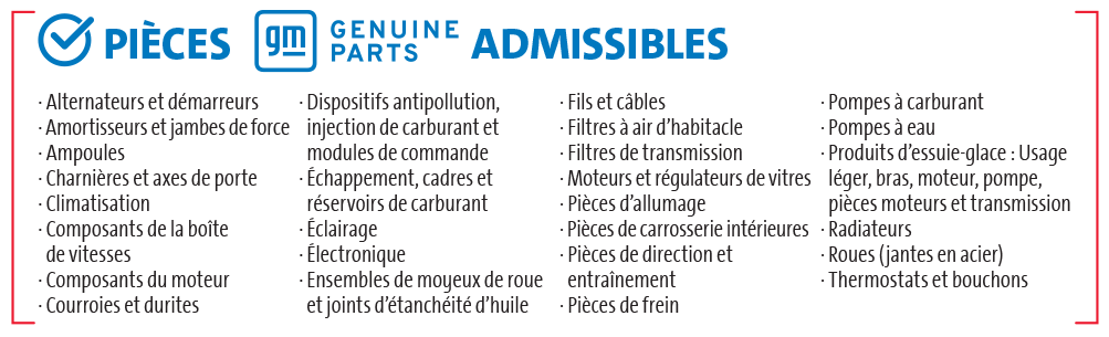 • Achetez pour au moins 300 $ de pièces GM d'origine admissibles pour obtenir trois (3) bulletins de participation et courir la chance de gagner l'un des trois (3) prix lors de nos soixante-cinq (65) tirages promotionnels.