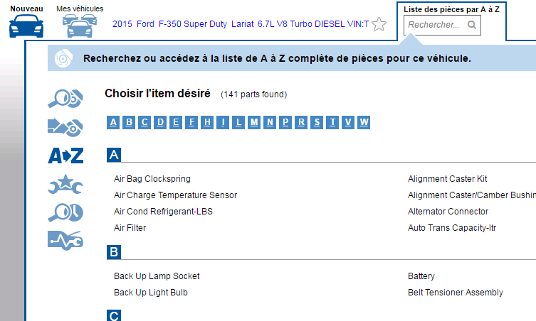 Une fois le véhicule choisi, vous pouvez accéder à l’écran de sélection « Liste de pièces A à Z » en cliquant sur « Liste de pièces A à Z » dans les options de recherche. L’écran se rafraîchira, affichant la liste de pièces A à Z pour le véhicule choisi.