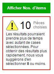 Le compteur « Pièces choisies » signalera lorsque le nombre de Types de pièce choisis atteint un niveau qui pourrait avoir un impact sur le rythme d’affichage des résultats. Vous aurez la possibilité de continuer; cependant, l’affichage des résultats pourrait prendre plus de temps.