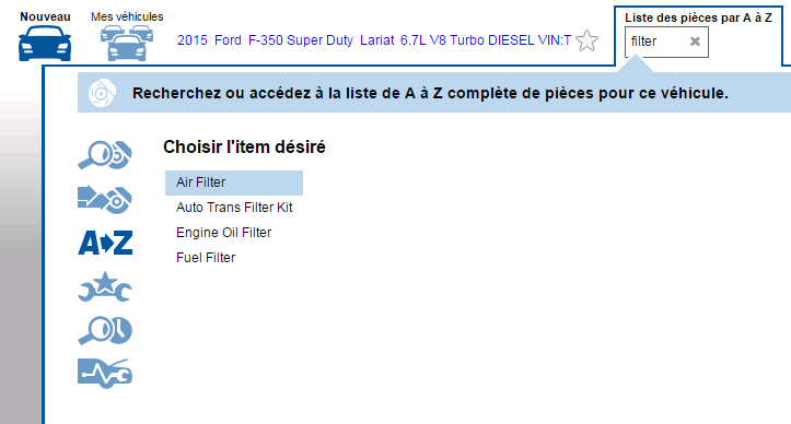 Vous en avez assez de feuilleter un catalogue en vous demandant « où diable ont-ils classé cette pièce »? La « Liste de pièces A à Z » vous fournit une liste de tous les types de pièces disponibles pour le véhicule choisi. Toutes les pièces énumérées conviennent à ce véhicule – fini les pertes de temps à chercher des pièces que vous ne pouvez pas acheter! Les Types de pièces s’affichent par ordre alphabétique pour éliminer le besoin de connaître leur catégorie.