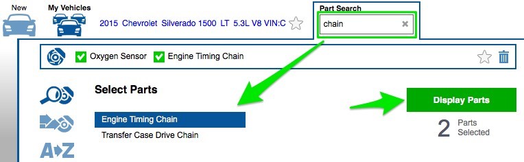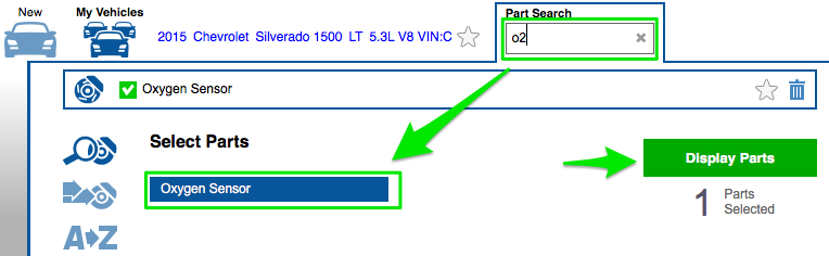 Example of a shorthand lookup “o2” will find Oxygen sensor parts.