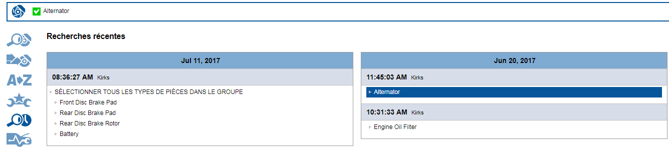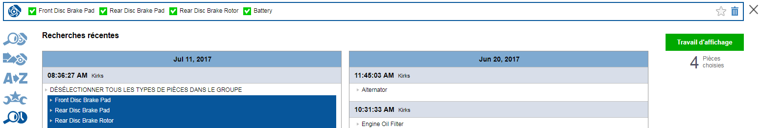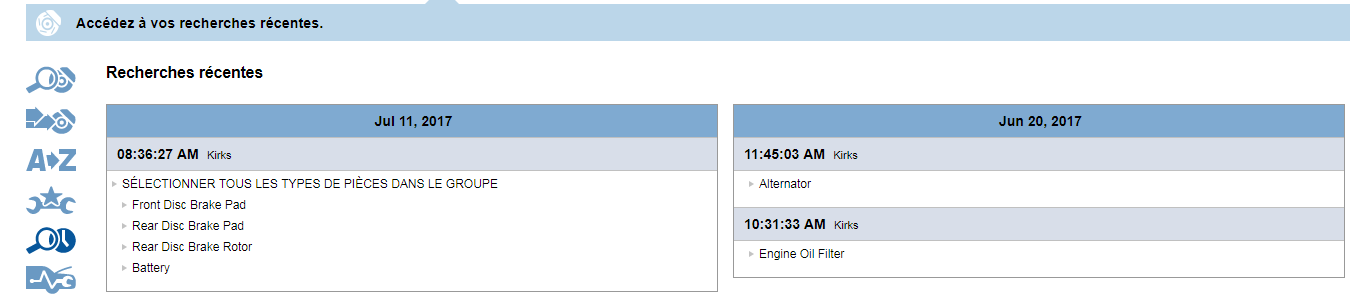 Les Recherches récentes s’afficheront lorsque le véhicule choisi a été récupéré des « Véhicules précédents » ou « Véhicules favoris » et indiqueront les recherches que vous avez effectuées pour le véhicule choisi.