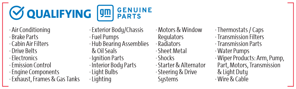 • Buy a minimum of $300 in net qualifying GM Genuine parts from your ACDelco supplier to earn three (3) draw ballots for a chance to win one of three (3) prizes in our sixty-five (65) promotional draws.
